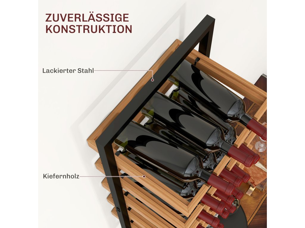 - Spolehlivá konstrukce: Tento stojan na víno, vyrobený z borovicového dřeva a lakované oceli, kombinuje přírodní krásu s odolností a je ideální do kuchyní, obývacích pokojů, domácích barů nebo vinných sklepů