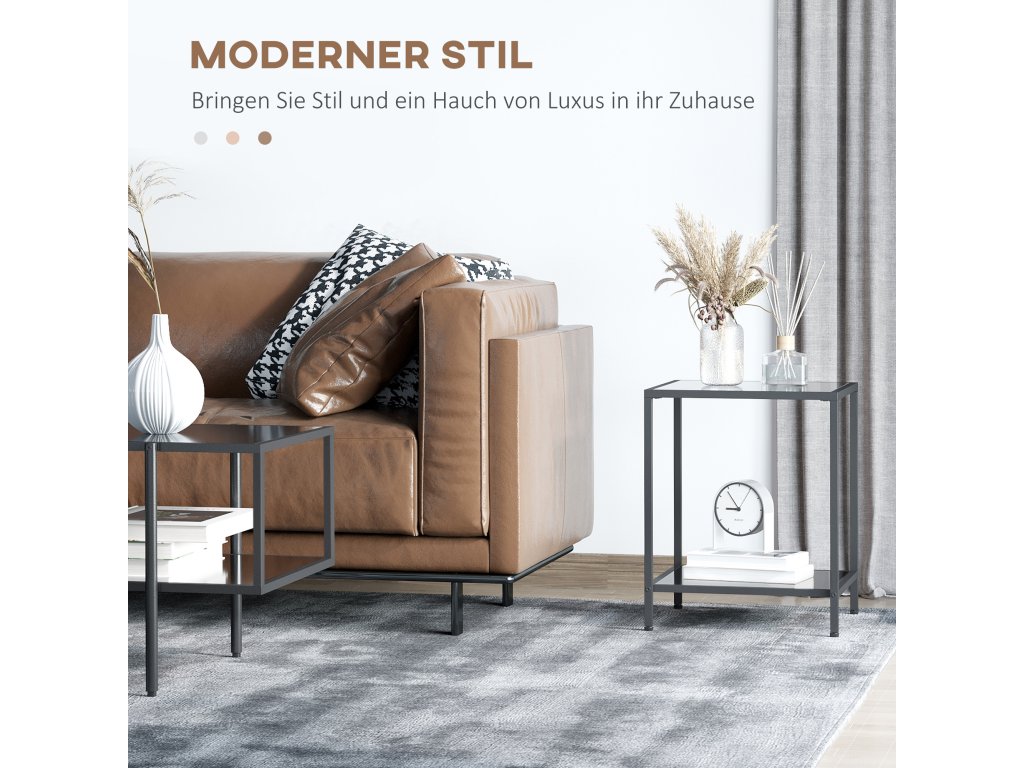 Malý odkládací stolek HOMCOM s úložným prostorem je nepostradatelný pro vaši domácnost nebo kancelář. Na dvou úrovních stolku v obývacím pokoji můžete vystavit vázy s květinami, knihy a dekorativní předměty - vše potřebné tak budete mít vždy po ruce. Desky z tvrzeného skla působí elegantním dojmem. Díky nastavitelným nožkám je stolek do obývacího pokoje vždy stabilní.