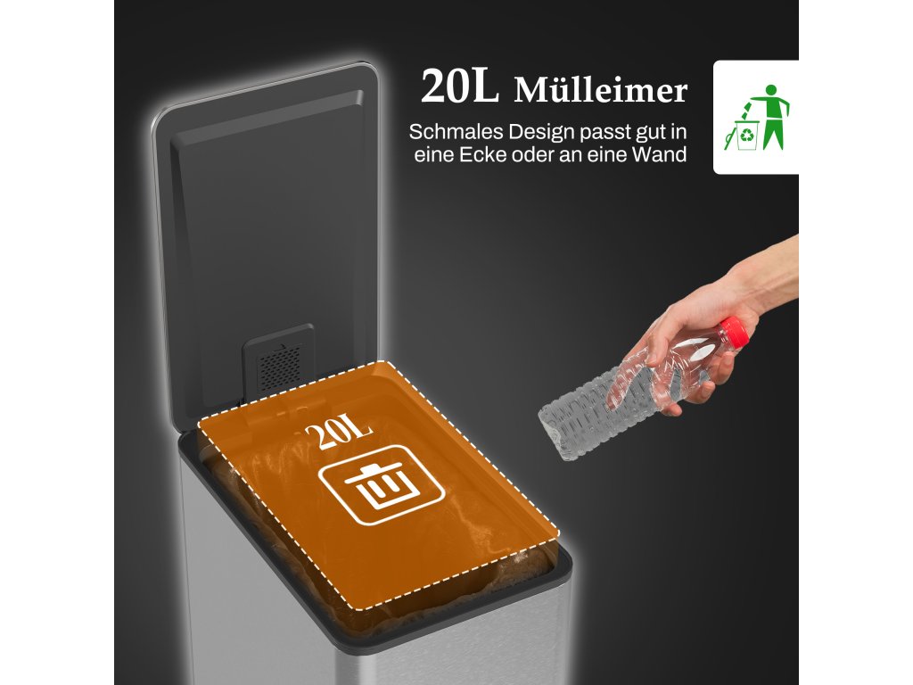 - Úsporný a prostorný: Tento kompaktní a úzký odpadkový koš o objemu 20 litrů se skvěle hodí do každého rohu nebo na stěnu vaší kuchyně. Zásobník na deodoranty odolný proti zápachu pomáhá eliminovat nepříjemné pachy (deodorant není součástí balení).
