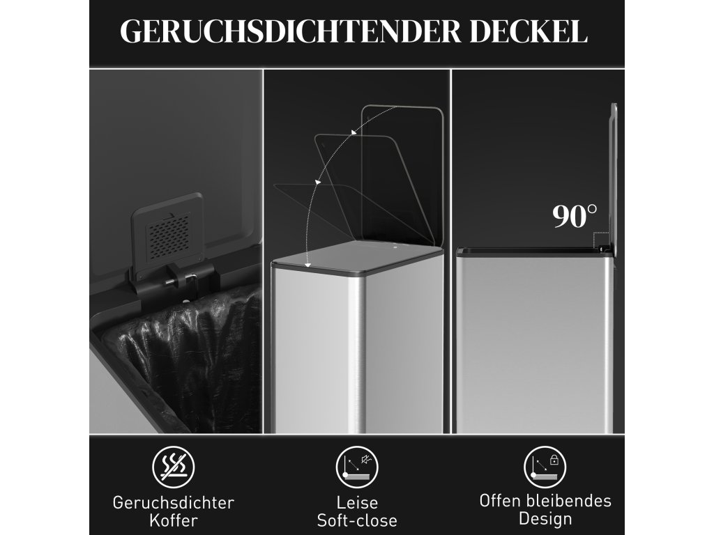 - ✔ Víko koše s měkkým zavíráním a otevíráním s přihrádkou na deodorant (není součástí dodávky) pro kontrolu zápachu