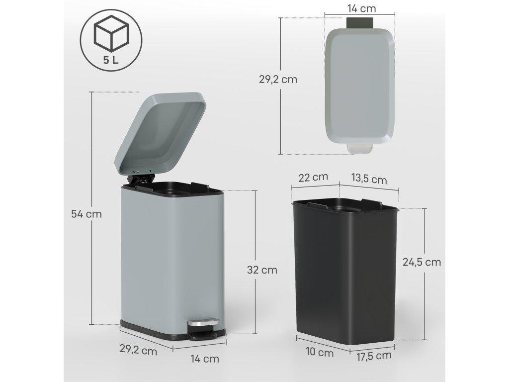 Tento kompaktní a elegantní obdélníkový odpadkový koš je ideální do kanceláří, koupelen a dalších prostor a zajistí, že váš domov už nikdy nebude neuklizený. Kovové pouzdro je robustní a příjemné na dotek. Pro větší pevnost a odolnost je opatřeno povrchovou úpravou. S objemem pět litrů nabízí dostatek prostoru. Navíc je vybaven vyjímatelným vnitřním košem pro snadné čištění, rukojetí pro vyjmutí a protiskluzovou základnou. Víko se zavírá jemně a tiše a spolu s velkým nožním pedálem zajišťuje snadné otevírání a zavírání.