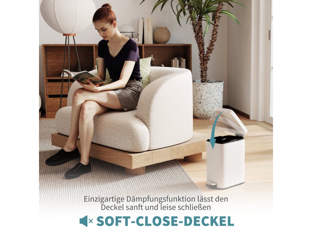 - Vnitřní koš: Plně vyjímatelný pro rychlé a snadné vyprazdňování. S horní rukojetí pro vyjmutí. Snadné použití, víko se otevírá tiše a během okamžiku - takže se nemusíte ničeho dotýkat.
