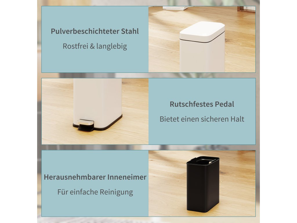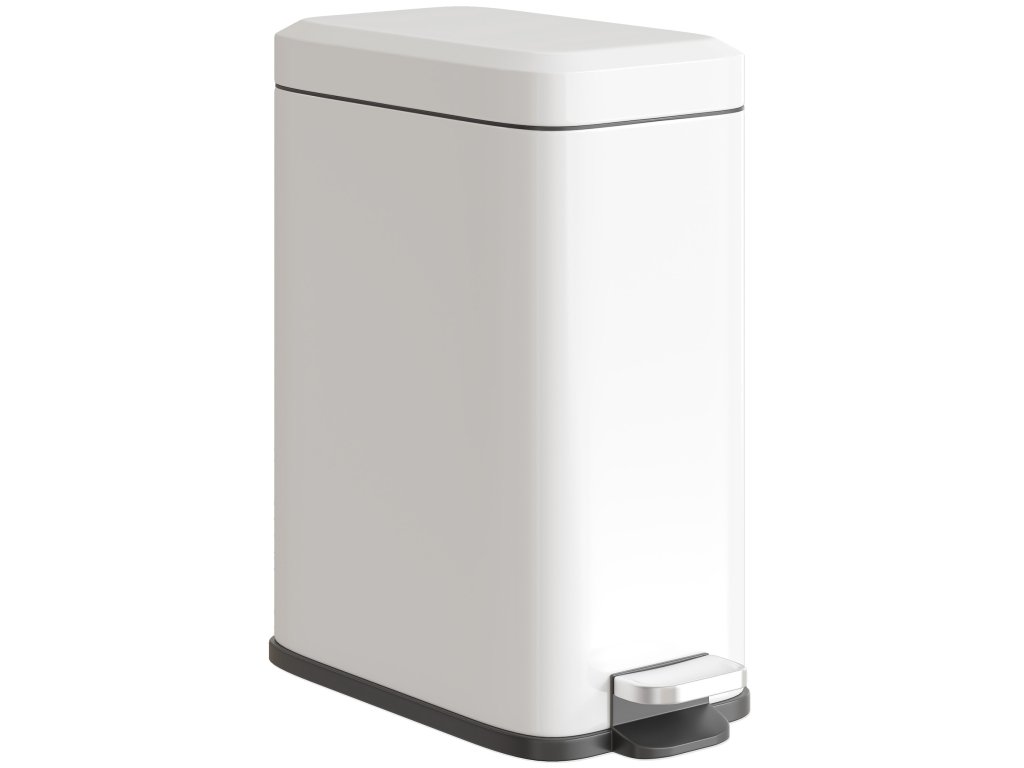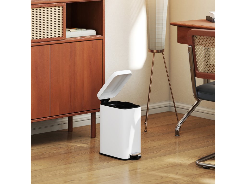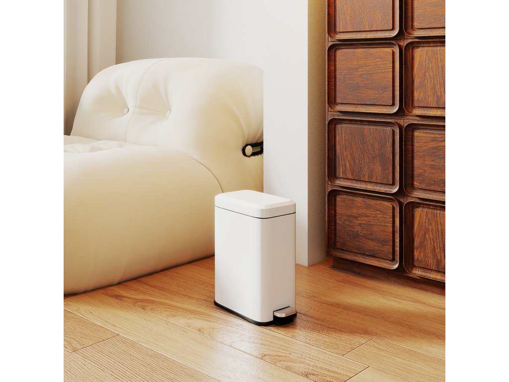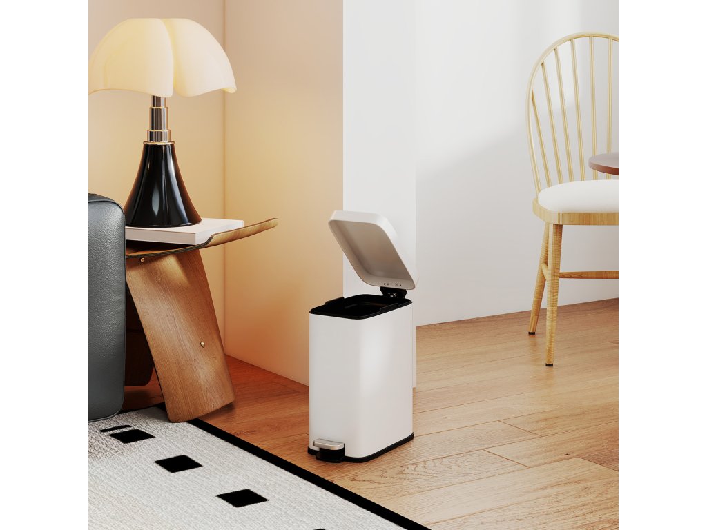 Tento kompaktní a elegantní obdélníkový odpadkový koš je ideální do kanceláří, koupelen a dalších prostor a zajistí, že váš domov už nikdy nebude neuklizený. Kovové pouzdro je robustní a příjemné na dotek. Pro větší pevnost a odolnost je opatřeno povrchovou úpravou. S objemem pět litrů nabízí dostatek prostoru. Navíc je vybaven vyjímatelným vnitřním košem pro snadné čištění, rukojetí pro vyjmutí a protiskluzovou základnou. Víko se zavírá jemně a tiše a spolu s velkým nožním pedálem zajišťuje snadné otevírání a zavírání.