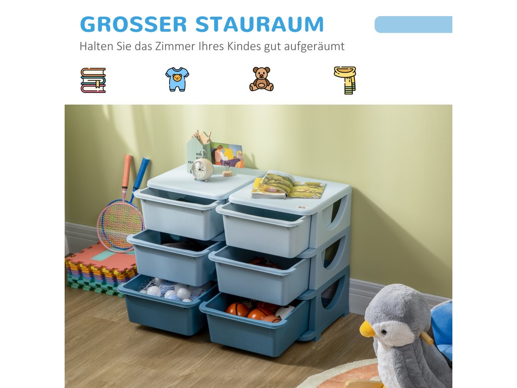 HOMCOM Plastový úložný box, 6 zásuvek, organizér na hračky, komoda do dětského pokoje, modrá | Aosom