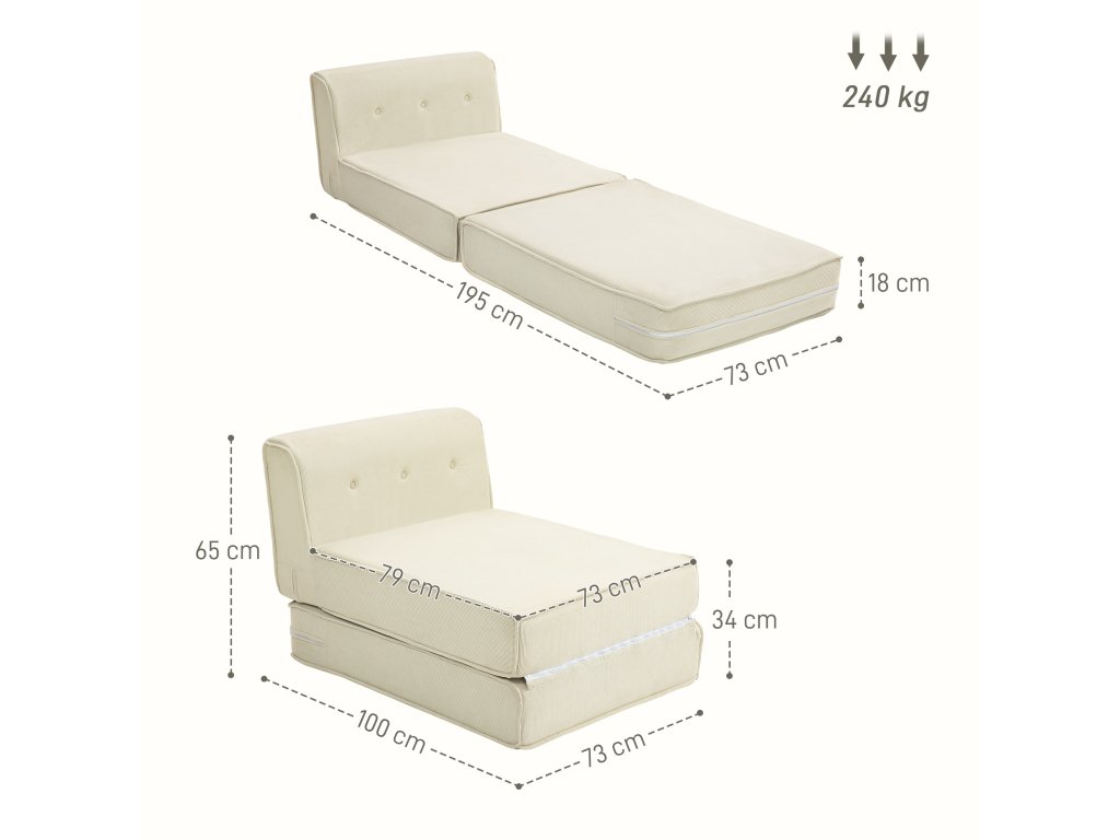 HOMCOM podlahová pohovka 2 v 1 rozkládací pohovka se vzhledem kabelu, čalouněná rozkládací pohovka s nosností do 240 kg do obývacího pokoje, ložnice, krémově bílá