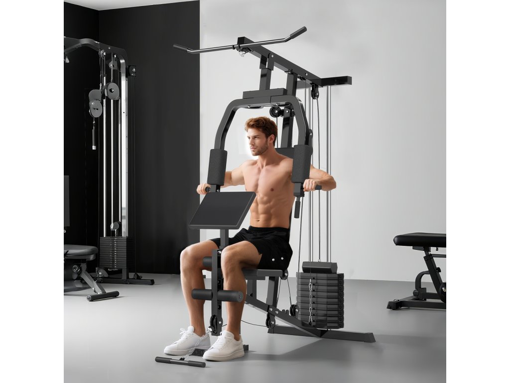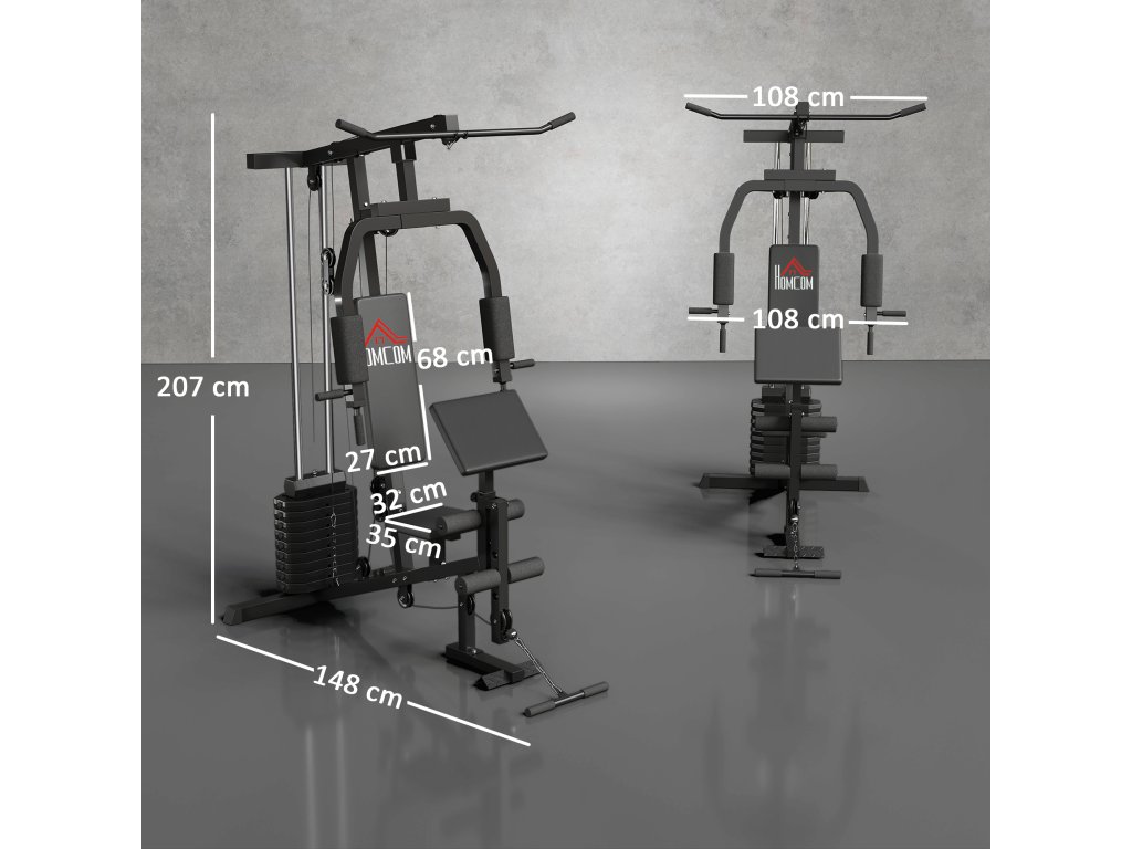 HOMCOM Posilovací stanice, posilovací zařízení, posilovací stanice, fitness centrum se závažím, válečkové polstrování, imitace kůže, černá, 148 x 108 x 207 cm| Aosom