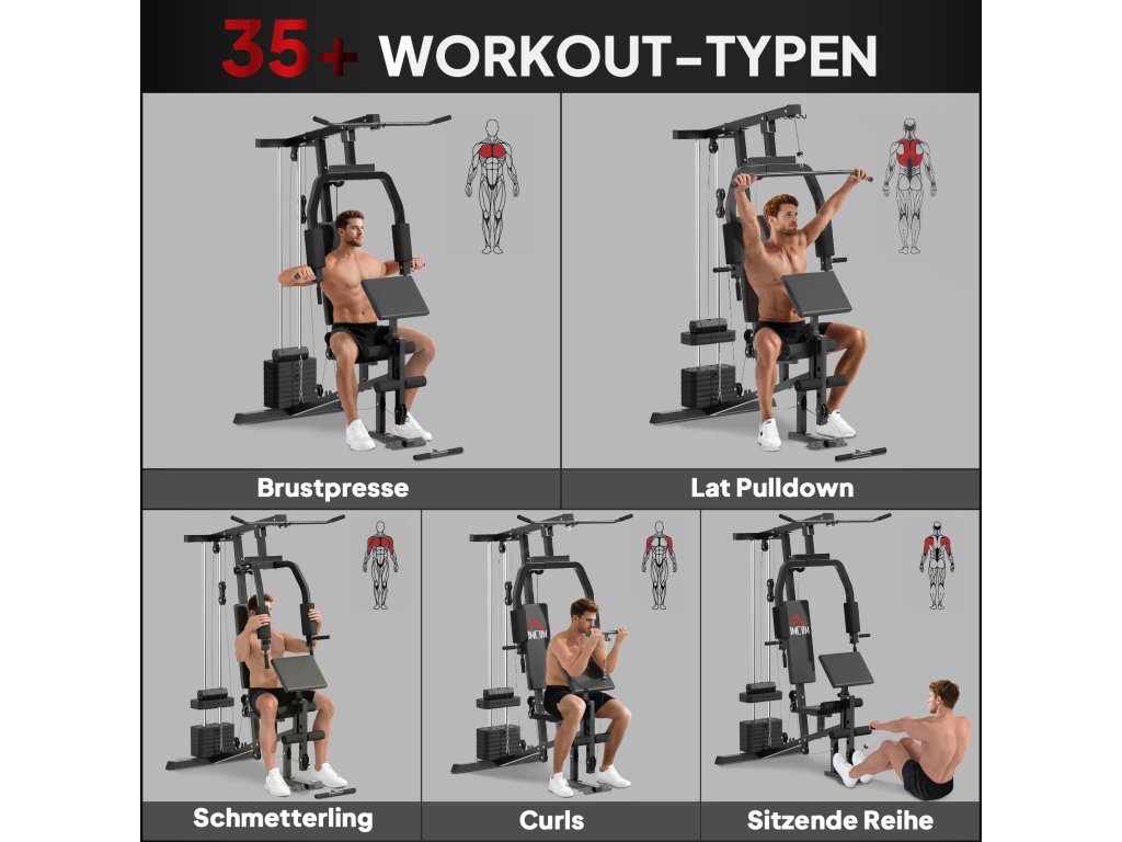 - Pohodlný trénink: Víceúčelové tréninkové zařízení s válečkovým polstrováním a plně funkčním trenažérem nohou zajišťuje pohodlný silový trénink. Úhel lze nastavit v rozmezí 0-90°. Přídavný trenažér nohou s duální funkcí umožňuje provádět extenze nohou.