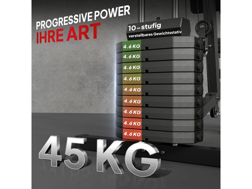 - ✔ Celková hmotnost protiváhy je 45 kg, včetně 9 kusů 4,6 kg bloků protiváhy a 1 kusu 3,6 kg bloku protiváhy