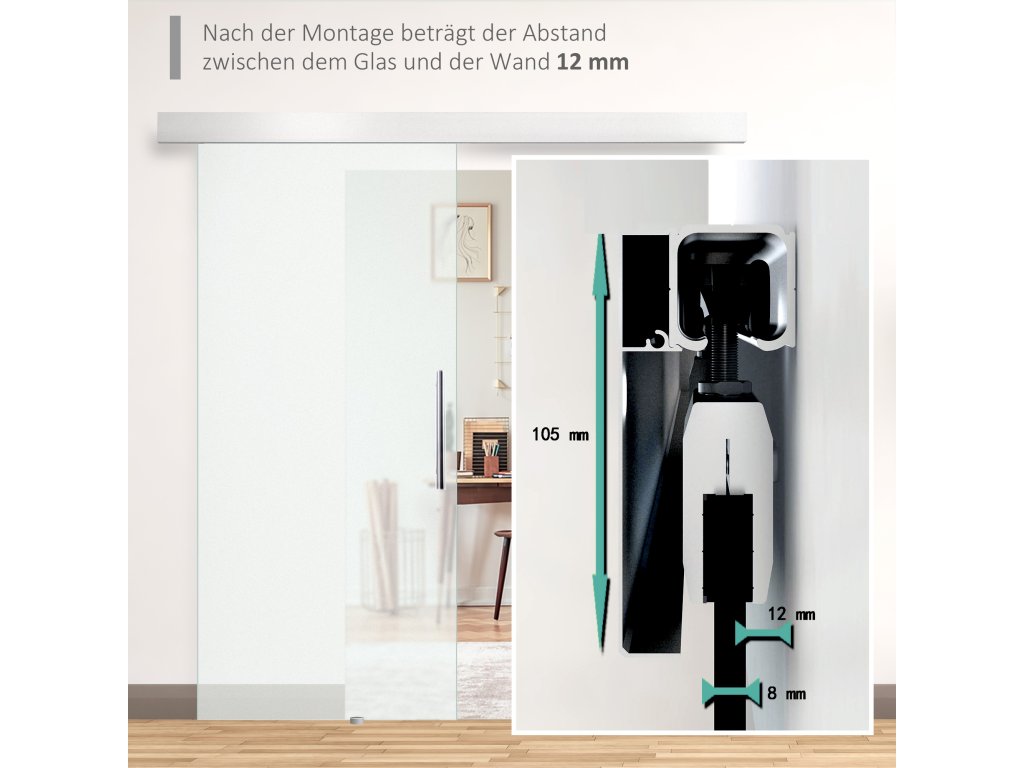 - Po instalaci je vzdálenost mezi skleněnými dveřmi a stěnou 12 mm