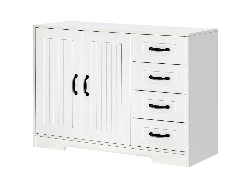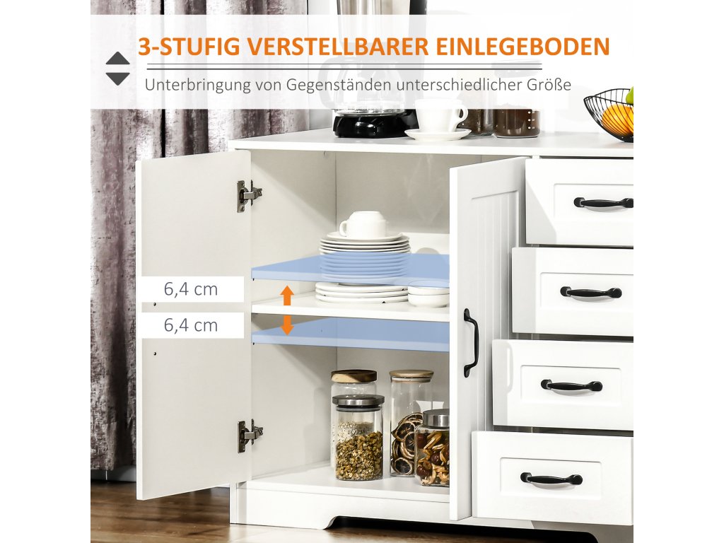 HOMCOM Příborník Bílá boční skříňka se 4 zásuvkami, nastavitelnou policí a ochranou proti překlopení do kuchyně a obývacího pokoje | Aosom.de