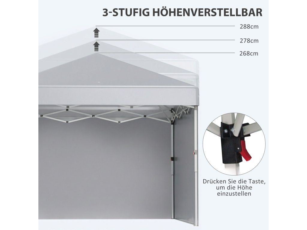 - Výškově nastavitelný: Výšku zahradního stanu snadno přizpůsobíte dané příležitosti změnou výšky podpěr stisknutím tlačítka. Na výběr máte ze tří výškových nastavení: 288/278/268 cm.