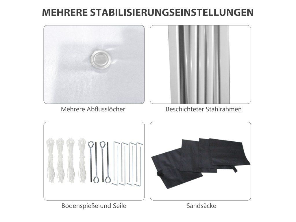 - Stabilní stojan: Dodává se s: Zemní hroty, napínací lana a čtyři pytle s pískem, které udrží párty stan bezpečně na místě. Několik drenážních otvorů zabraňuje hromadění vody na vrcholu. Ocelový rám s povrchovou úpravou vám navíc nabízí vysokou odolnost a stabilitu.