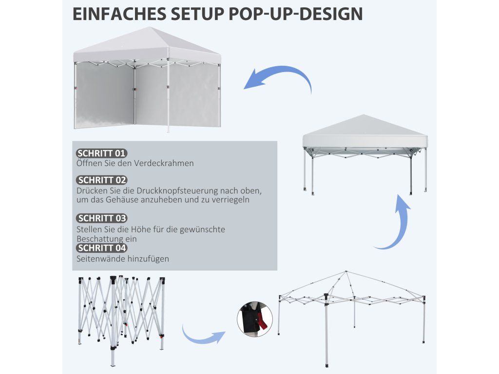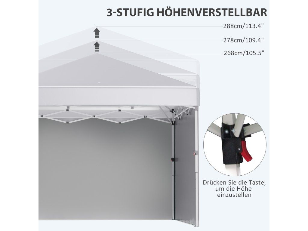 - Výškově nastavitelný: Výšku zahradního stanu snadno přizpůsobíte dané příležitosti změnou výšky podpěr stisknutím tlačítka. Na výběr máte ze tří výškových nastavení: 288/278/268 cm.