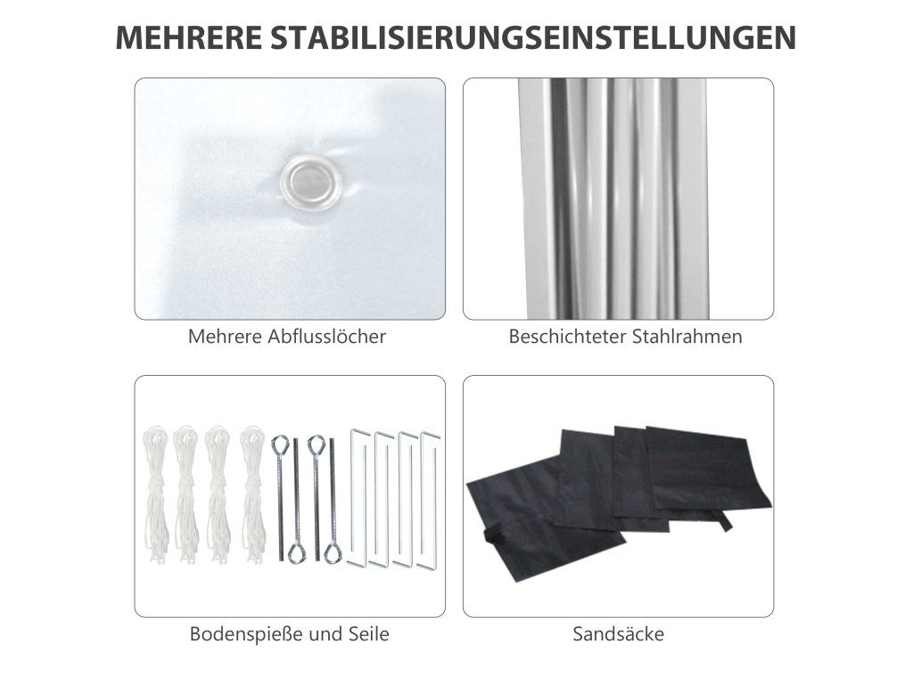 - Stabilní stojan: Dodává se s: Zemní hroty, napínací lana a čtyři pytle s pískem, které udrží párty stan bezpečně na místě. Několik drenážních otvorů zabraňuje hromadění vody na vrcholu. Ocelový rám s povrchovou úpravou vám navíc nabízí vysokou odolnost a stabilitu.