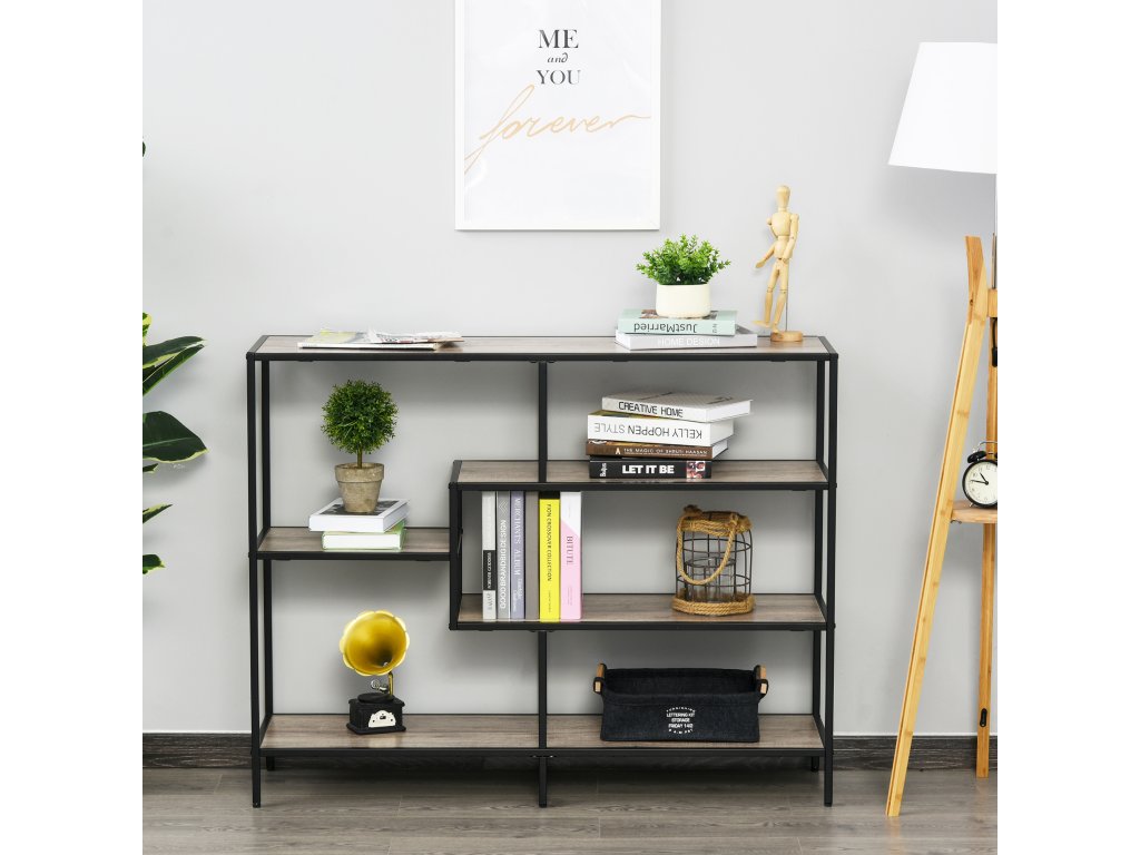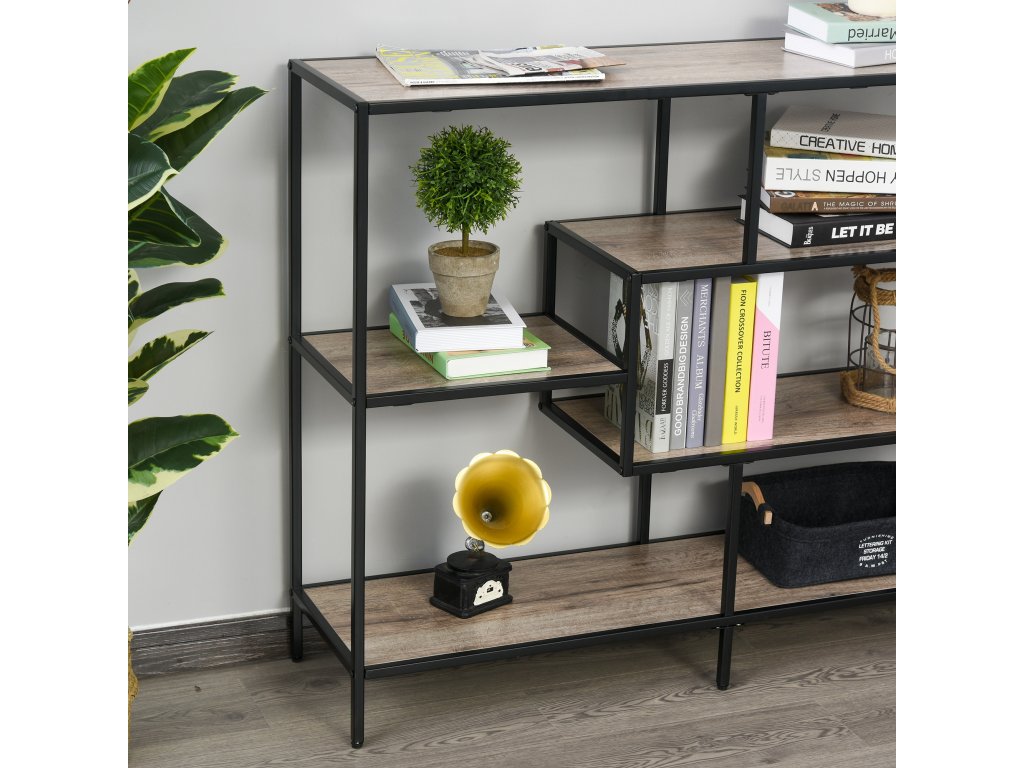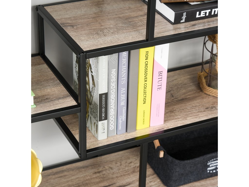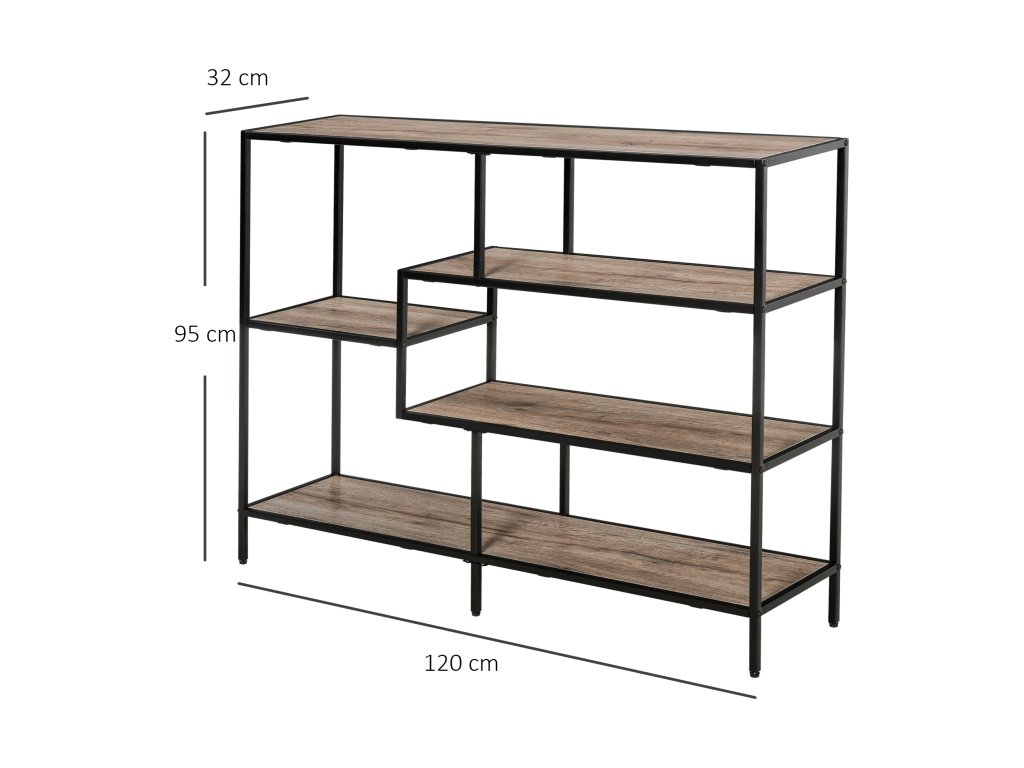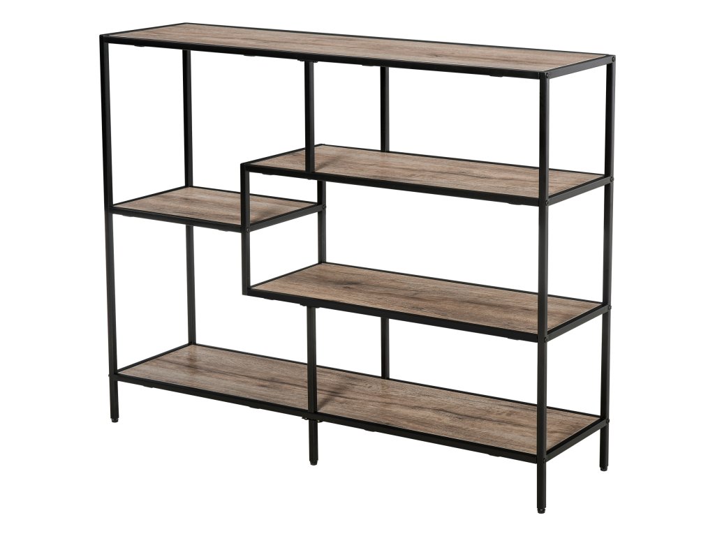 Jste připraveni kreativně vystavit své sbírky? Tento úložný regál je ideální volbou. Jedinečný asymetrický design a dvoubarevná konstrukce z rustikálního dubového dřeva a hladké tmavé barvy jí pomáhají působit odvážně v každém prostředí. pět otevřených polic poskytuje dostatek úložného prostoru. Regál je vyroben z robustního kovového rámu a masivní dřevotřískové desky P2 a je odolným a atraktivním doplňkem obývacího pokoje nebo domácí kanceláře.