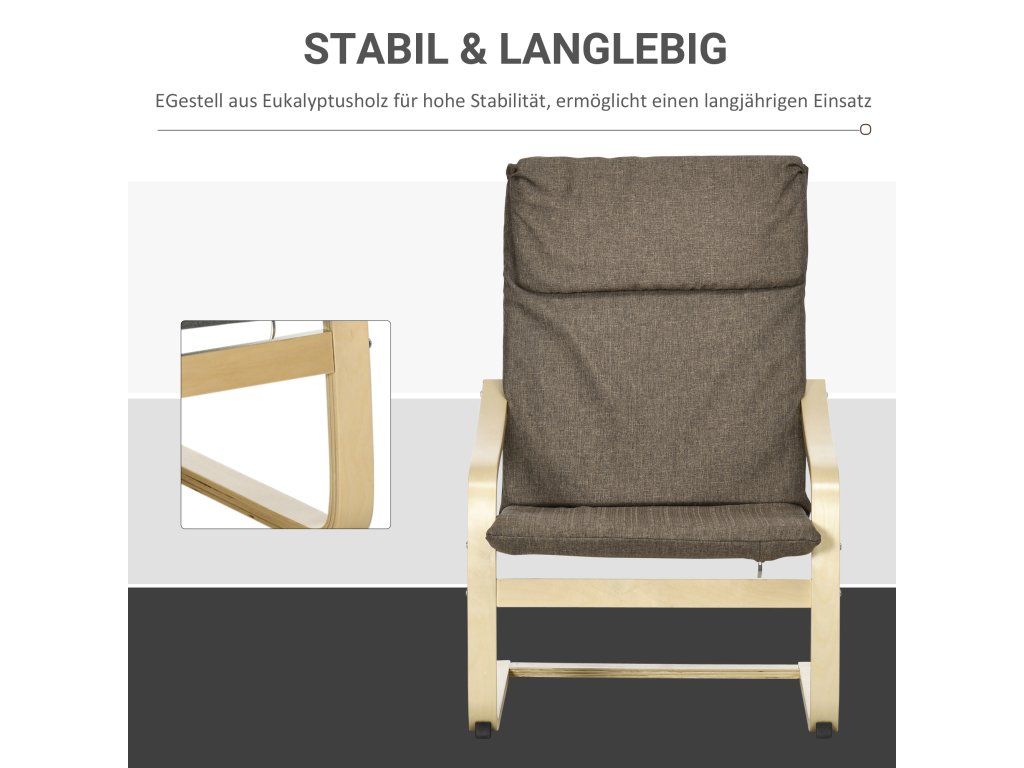 Čalouněná židle HOMCOM má vnější materiál lněného vzhledu a dřevěný rám. Jednoduchý, ale elegantní design je vždy v módě. Toto univerzální křeslo je vhodné do obývacího pokoje, ložnice, kanceláře a díky své lehké a kompaktní konstrukci se dá také snadno přenášet a přepravovat. S tímto polohovacím křeslem HOMCOM bude váš život mnohem pohodlnější!