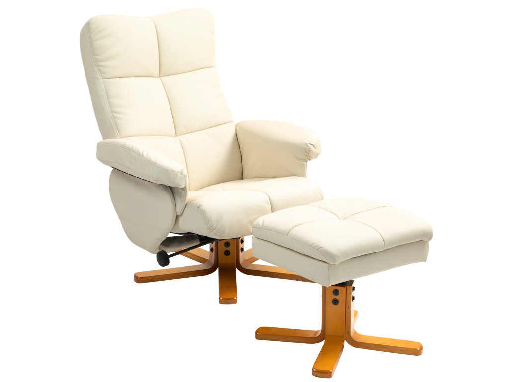 HOMCOM Relaxační křeslo s taburetem, úložný prostor, čalouněné TV křeslo s funkcí polohování, otočné TV křeslo 360° do ložnice, obývacího pokoje, imitace kůže, krémově bílá barva