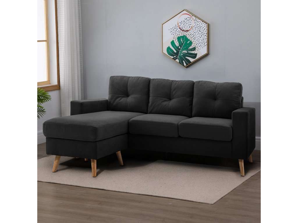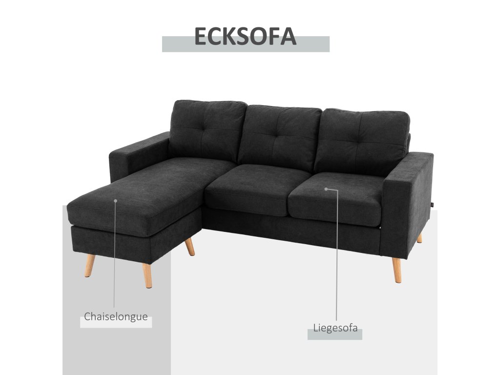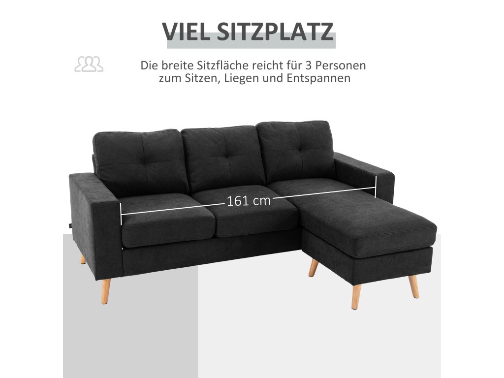 HOMCOM Rohová sedací souprava ve tvaru L, černá rohová sedací souprava s lehátkem, vzhled lnu, do obývacího pokoje, 3 osoby| Aosom