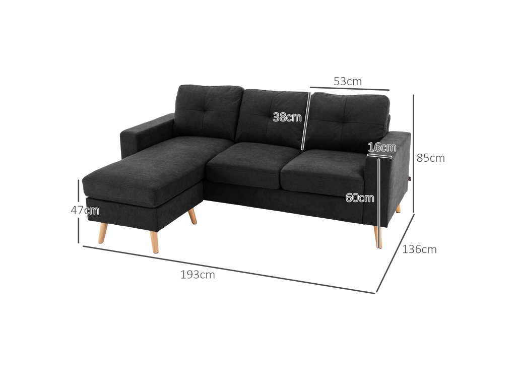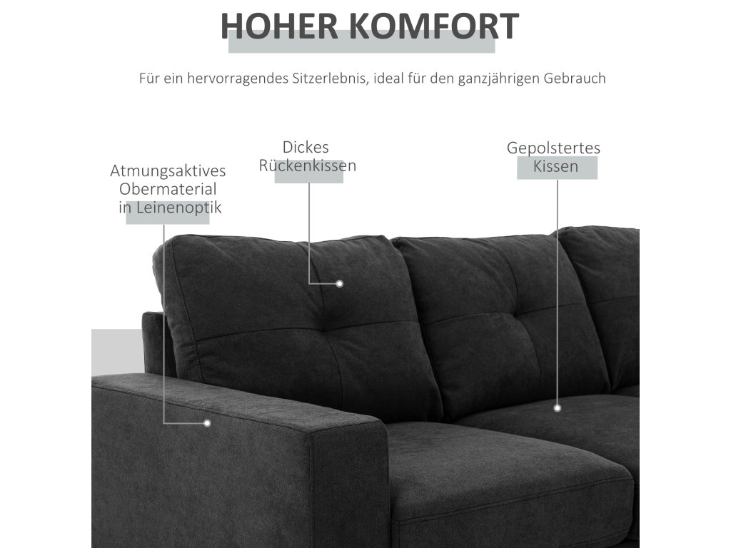 Třímístná rohová pohovka od společnosti HOMCOM je ideální pro filmové večery s přáteli nebo pohodové večery při čtení. Dřevěný rám je měkce čalouněný a má prodyšný lněný potah, který je snímatelný a pratelný. Ideální do každého prostředí!