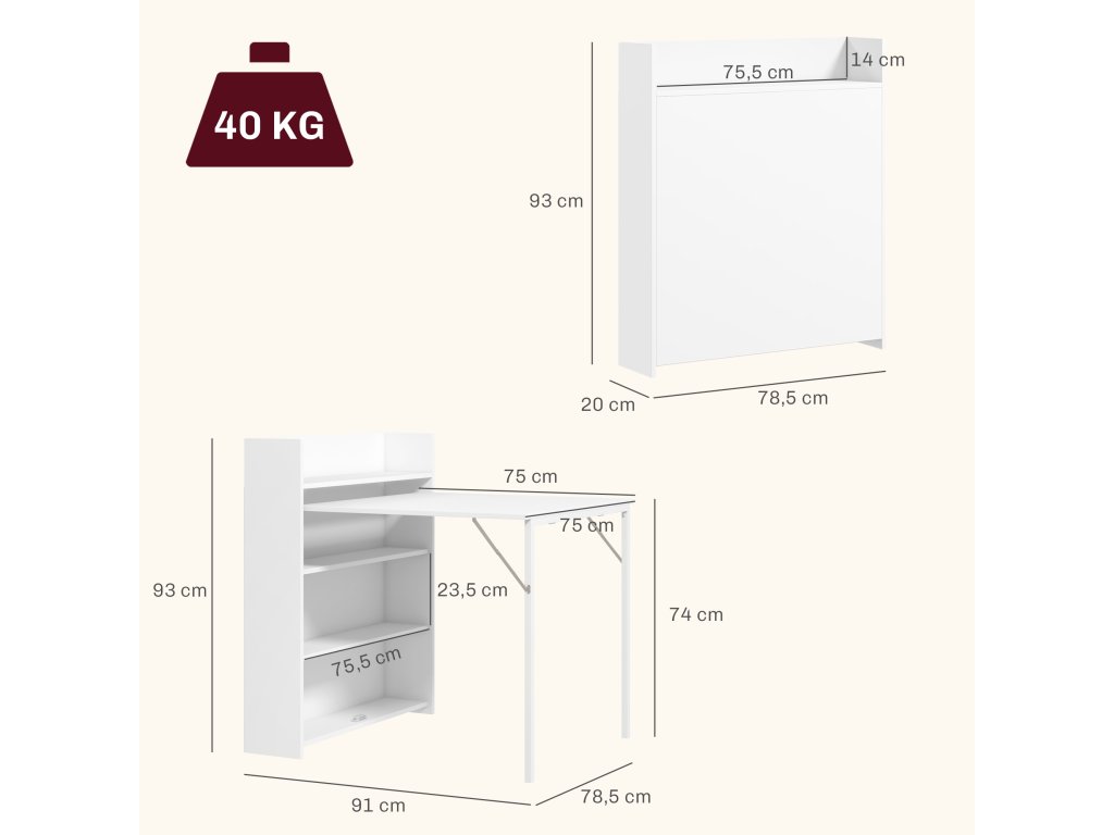 - Rozměry v rozloženém stavu: 80 Š x 90 H x 93 V cm, rozměry ve složeném stavu: 80 Š x 20 H x 93 V cm. Nosnost jídelního stolu: 40 kg celkem, 20 kg pro desku stolu, 5 kg pro každou polici. Nutná montáž