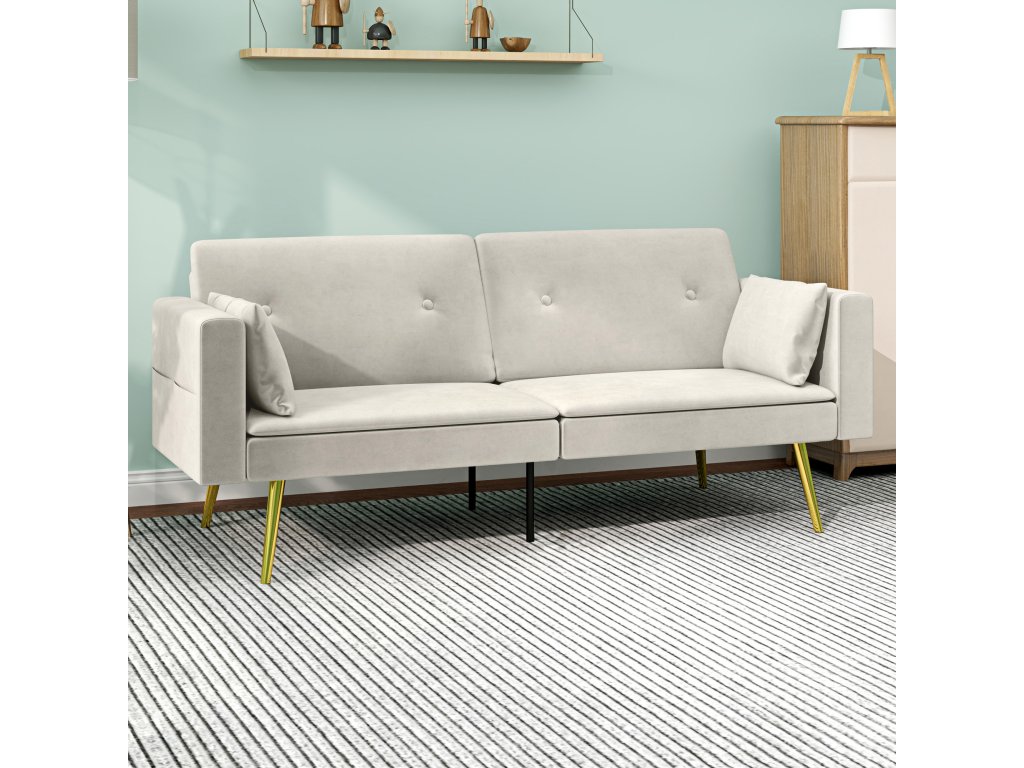 HOMCOM Rozkládací pohovka, rozkládací pohovka s polohovatelným opěradlem, boční kapsa, čalouněná 2místná rozkládací pohovka s funkcí spaní, polštáře, do obývacího pokoje, ložnice, béžová barva