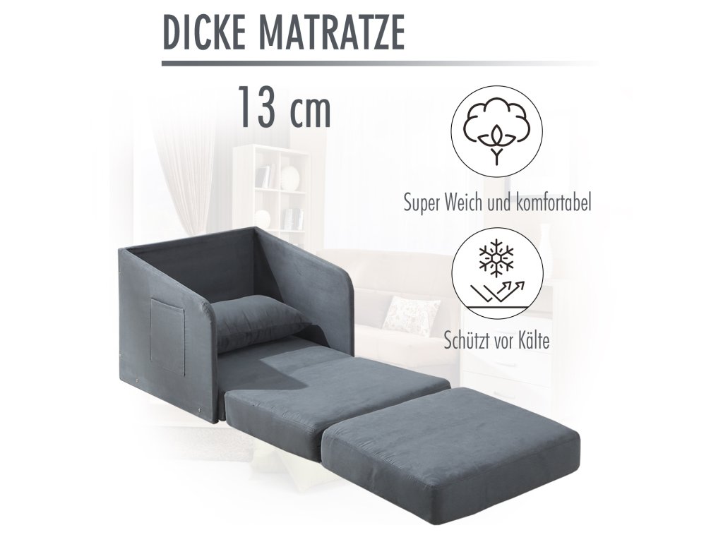 Útulné jako křeslo, mimořádně pohodlné jako postel: křeslo na spaní HOMCOM je pěkný a prostorově úsporný detail do obývacího pokoje, pracovny nebo dětského pokoje. Jeho přeměna ze sedačky na postel je snadná a lze ji provést v několika jednoduchých krocích. Na vnější straně područek jsou dvě kapsy, například na materiály ke čtení. Základem křesla lůžka je robustní kovový rám. Čalounění je vyrobeno ze silné výstavní látky a snímatelný a pratelný potah je z imitace semiše. Polštář na zádech lze použít také jako polštář. Rozkládací pohovka je všestranný pomocník, který potěší i vaši noční návštěvu.