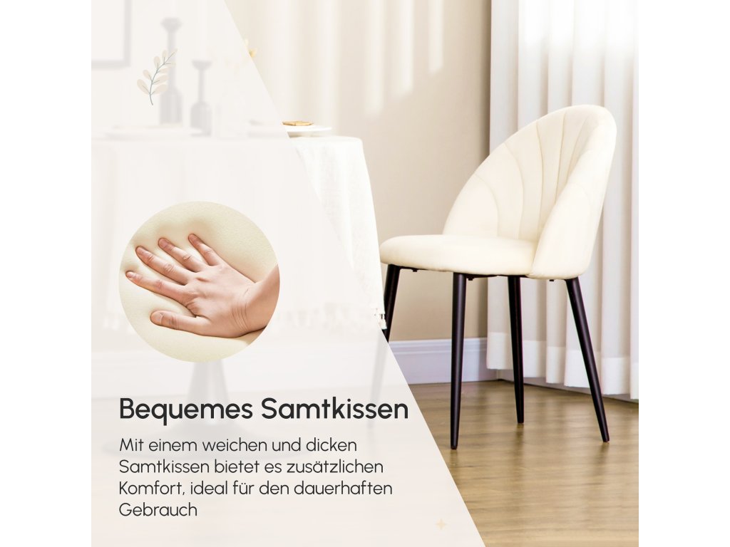 Tato souprava židlí od společnosti HOMCOM je díky svým elegantním liniím a jedinečnému designu skořepiny skvělým doplňkem do každé místnosti. Zejména do jídelny nebo obývacího pokoje. Hustě polstrovaný sedák a měkké opěradlo poskytují vynikající zážitek ze sezení. Sametový vzhled tvaru a materiálu dodává těmto židlím elegantní glamour chic vzhled.