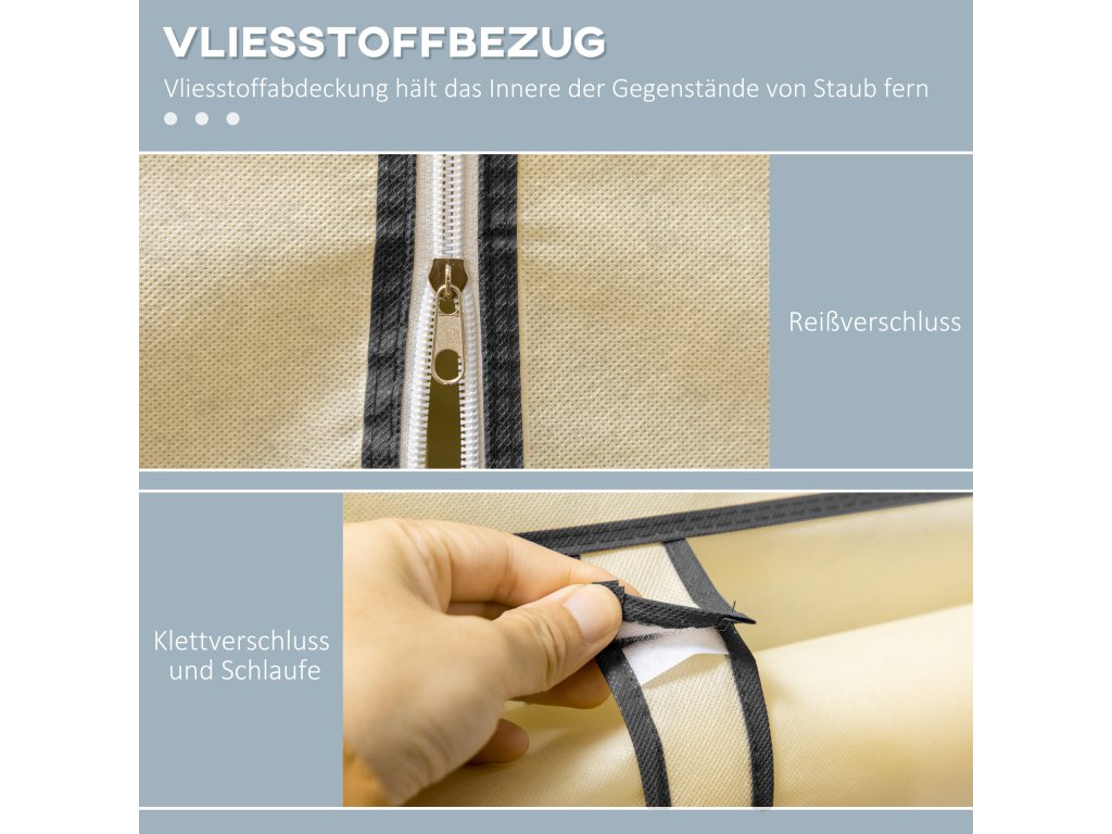 - Snadné otevírání a zavírání: Vnější materiál s fleecovým vzhledem chrání oblečení a předměty před prachem. Zip usnadňuje otevírání a zavírání, zatímco suchý zip umožňuje srolování a zajištění.