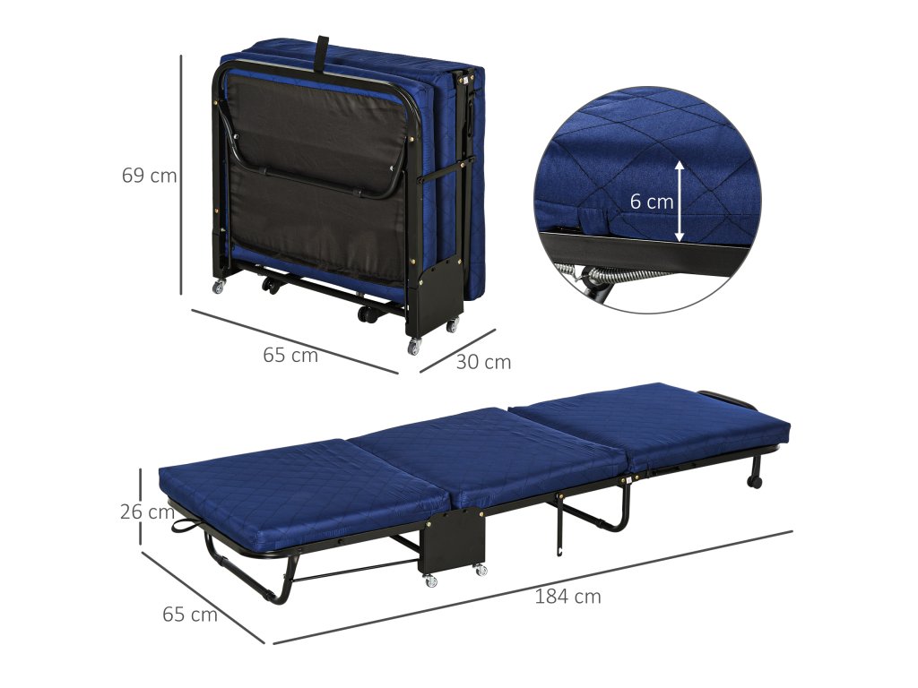 HOMCOM Skládací postel pro hosty 2 v 1 s nastavitelným čelem a kolečky, ocelový rám, pěna, modrá 184x65x26cm pro flexibilní spaní | Aosom.de