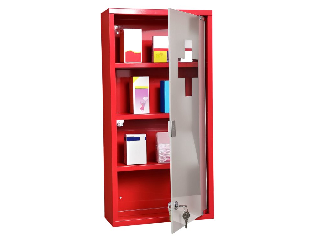 Uložte svou malou lékárničku s klidem do naší červené lékárničky. Je vyrobena z vysoce kvalitního kovu a bezpečnostního skla, takže je robustní a snadno se čistí. Dvířka z matného skla lze uzamknout a jsou vybavena automatickým mechanismem vyklápění. Díky tomu lze dvířka snadno otevřít jednou rukou. Skříňku na léky snadno sestavíte a připevníte na zeď, i když nemáte žádné manuální dovednosti. Vaše léky a léčiva tak budou bezpečně uloženy a vždy po ruce.