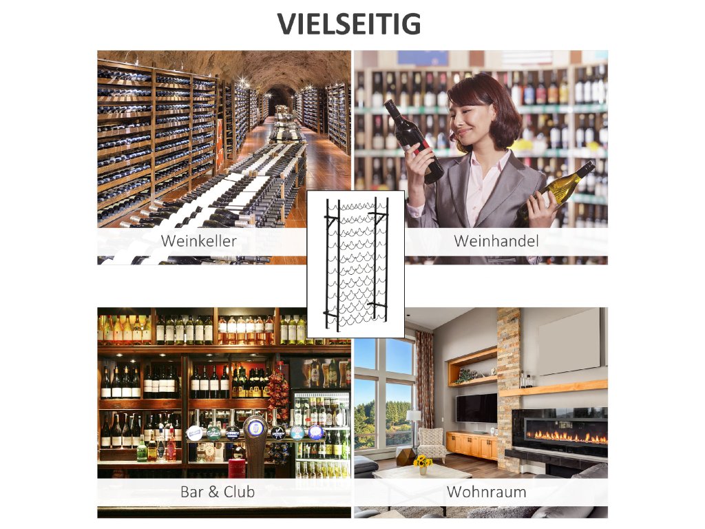 Uložte své láhve vína bezpečně do našeho robustního stojanu na víno. Stojan na víno je vyroben z pevného a elegantního kovu. Díky uspořádání různých úrovní lze do stojanu uložit až 60 lahví vína, ačkoli by neměla být překročena maximální nosnost 50 kg. Kromě vysoké stability jsou na zadní straně regálu možnosti upevnění, díky kterým jej můžete přišroubovat ke zdi. To poskytuje dodatečnou bezpečnost. S naším regálem na víno si můžete do svého domova přinést dekorativní stojan na víno.