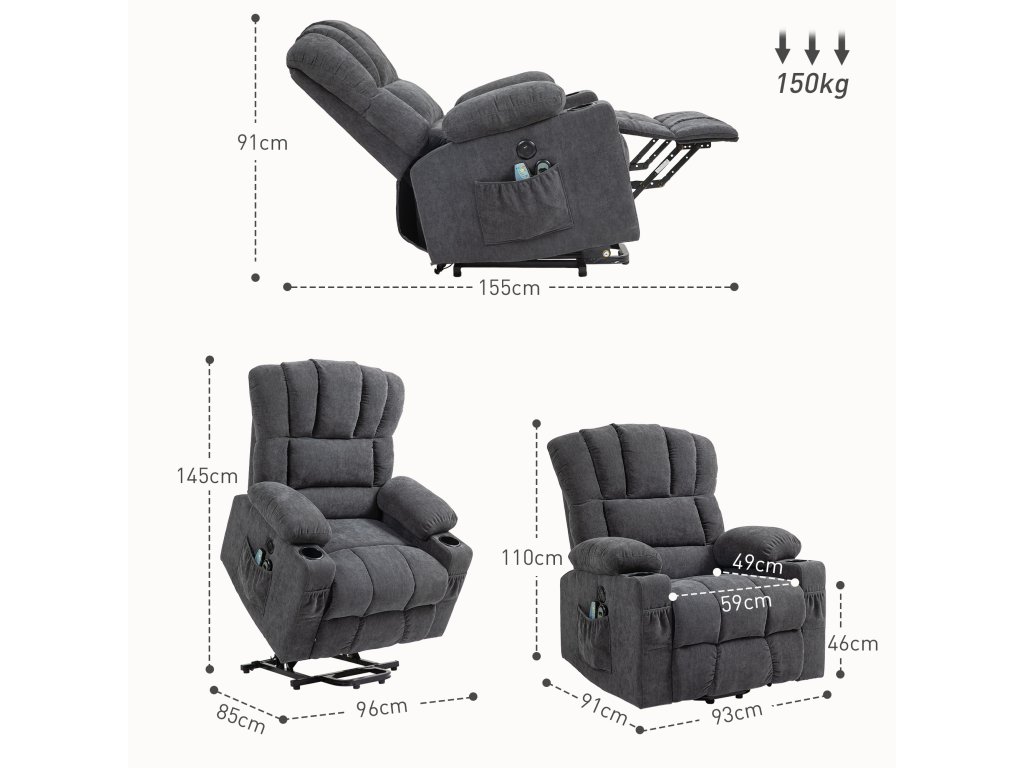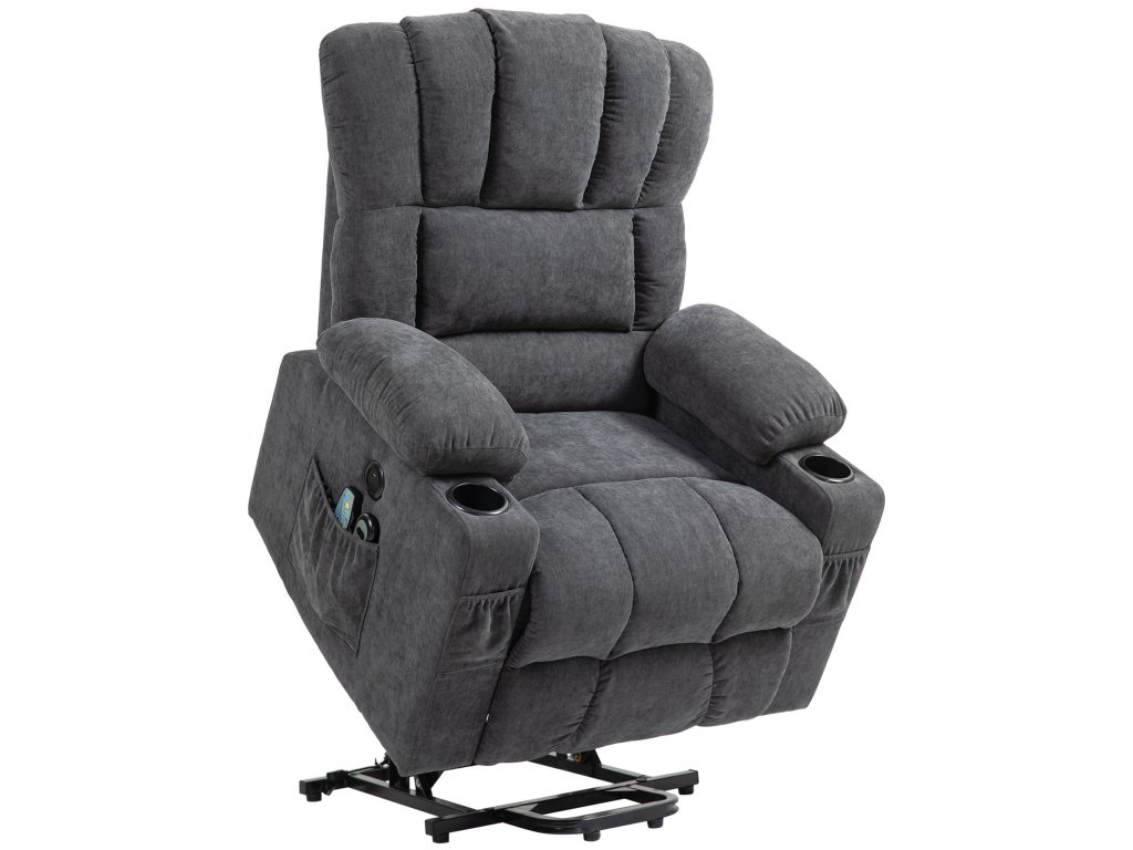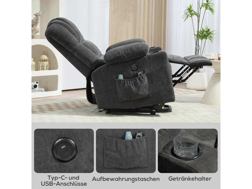 HOMCOM TV křeslo se stojánkem Elektrické polohovací křeslo s polohováním, vyhříváním a masážní funkcí, TV křeslo s porty Type-C a USB, držák na nápoje, tmavě šedá barva