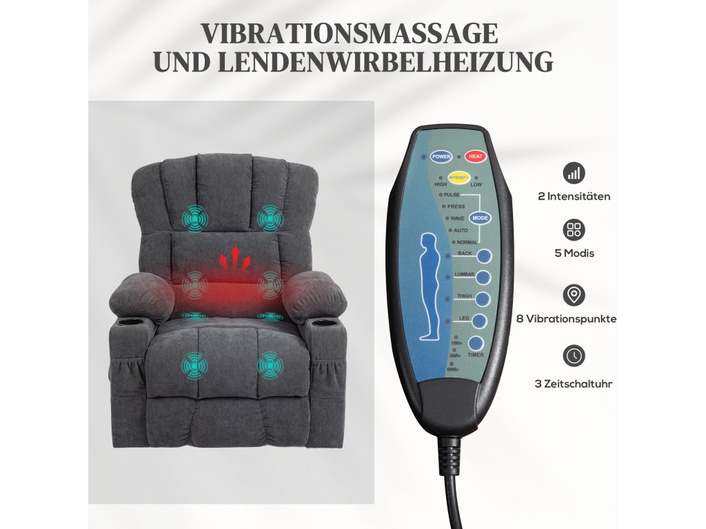 - Masážní a vyhřívací funkce: Díky osmi vibračním masážním bodům, pěti masážním programům a dvěma stupňům intenzity a vyhřívání bederní části nabízí toto polohovací křeslo větší pohodlí