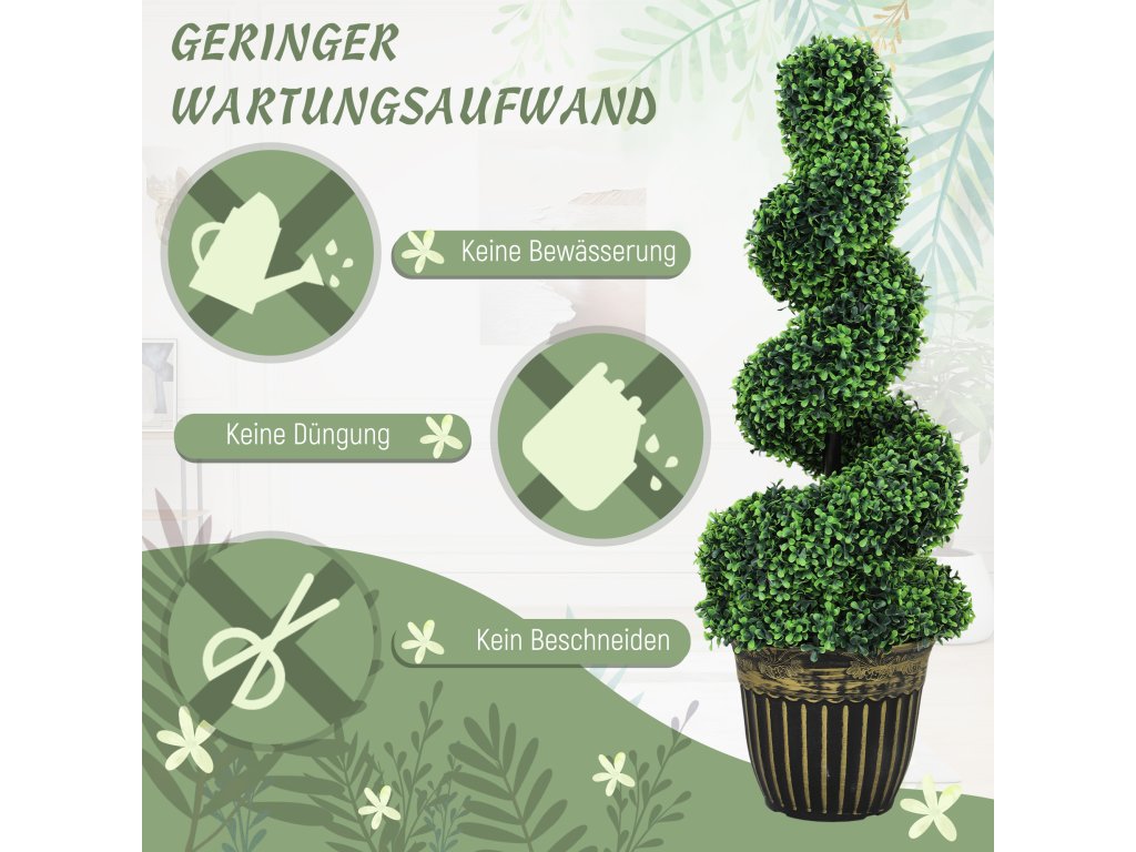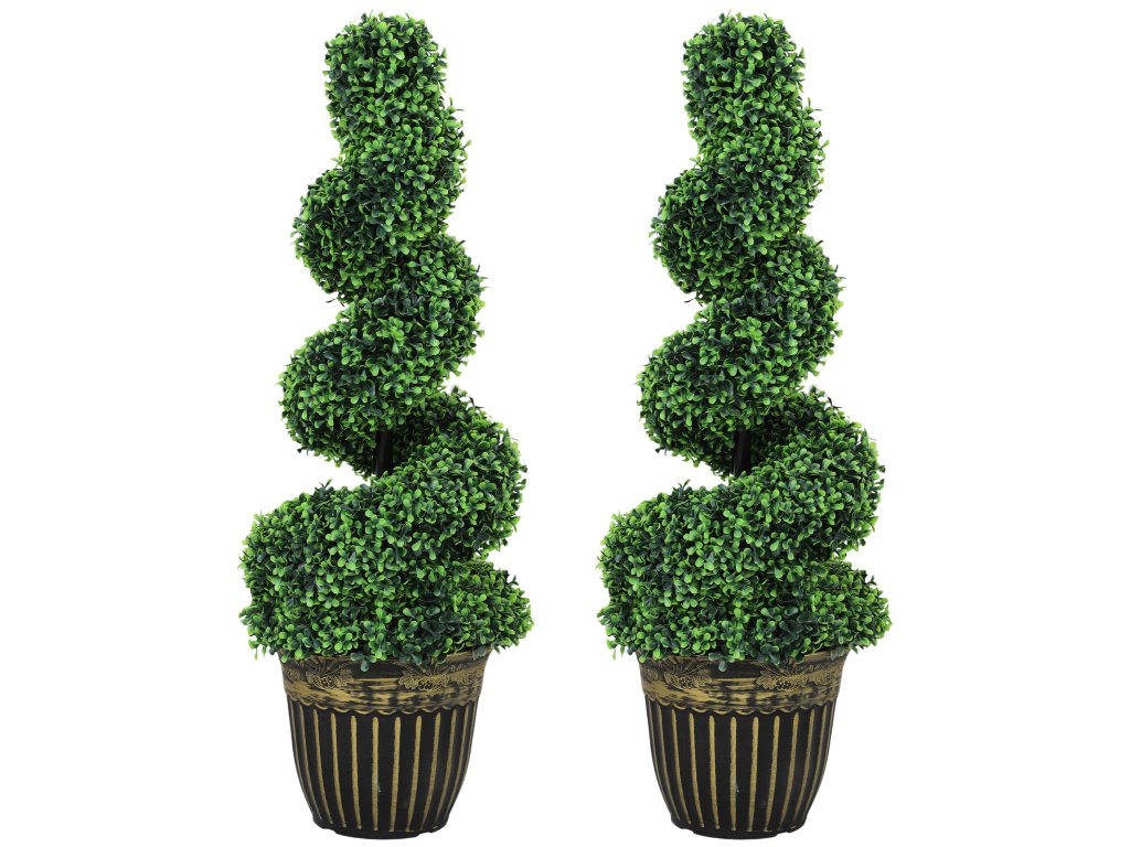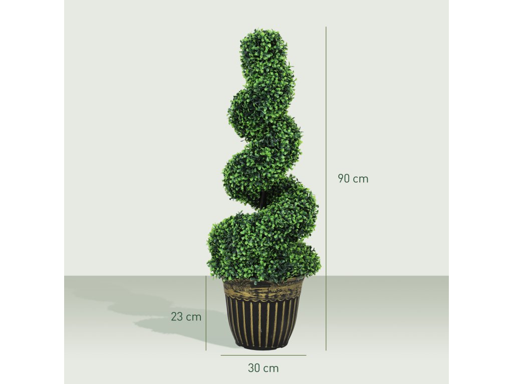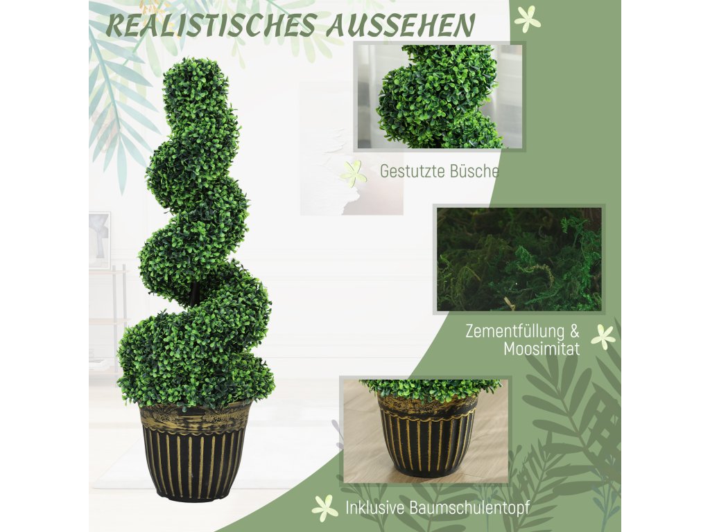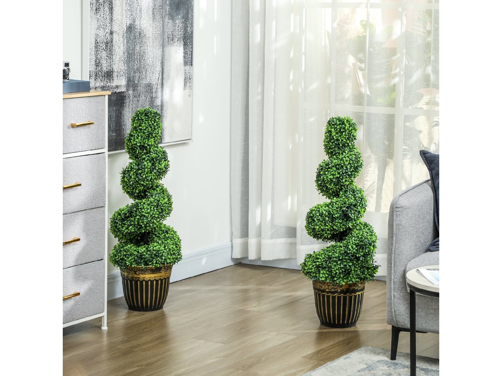 Dodejte svému domovu nádech zeleně po celý rok s těmito dvěma umělými stromky ve tvaru spirály od společnosti Outsunny. Tyto umělé rostliny se snadnou údržbou zůstávají trvale zelené a nevyžadují žádné stříhání ani údržbu. Každá z nich má 1300 listů a jejich realistická barva a struktura jim dodává klamně reálný vzhled. Květináče, které jsou součástí dodávky, jsou vyplněny cementem, aby byla zajištěna nekompromisní stabilita. Ideální pro výzdobu každé místnosti!