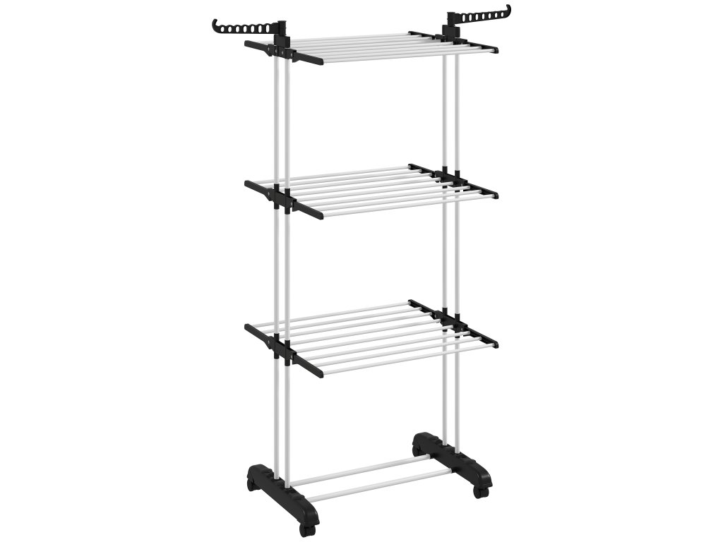 - ✔ 4 úrovně, každá se 2 skládacími bočními křídly, a také 14 háčků na ramínka na oblečení a spodní polička na boty