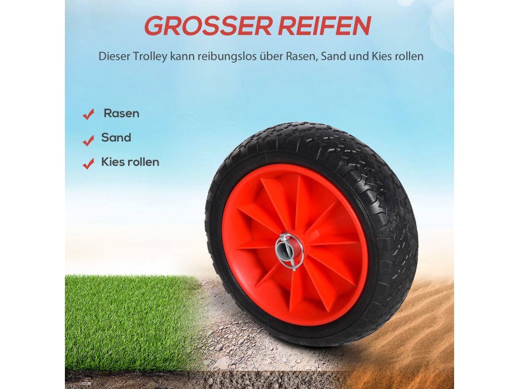 - Velké pneumatiky: Díky dvěma širokým pneumatikám ze syntetické kůže se nemusíte bát, že byste píchli. Surfovací vozík je tak vždy připraven k bezproblémovému použití na nerovném povrchu, jako je pláž nebo štěrk.