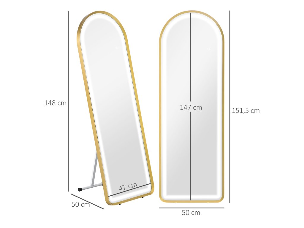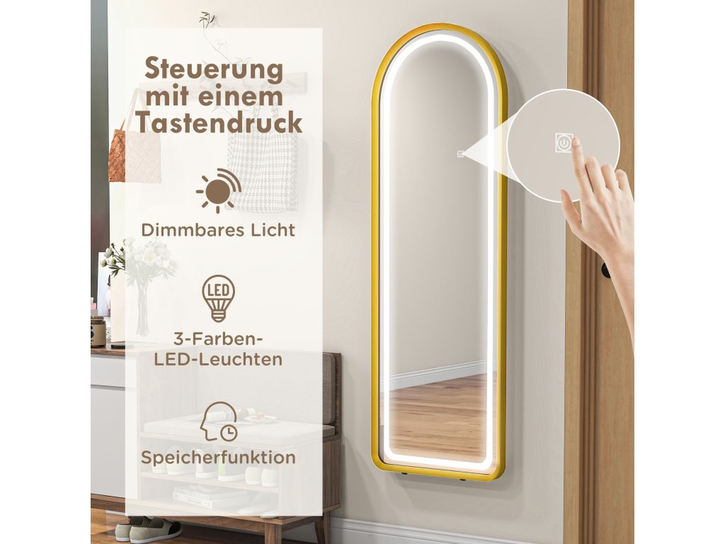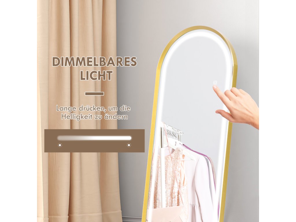 HOMCOM Zrcadlo po celé délce se stmívatelným LED světlem, nástěnné a stojací zrcadlo, šatní zrcadlo s dotykovým spínačem, zlaté 47x146 cm | Aosom.de