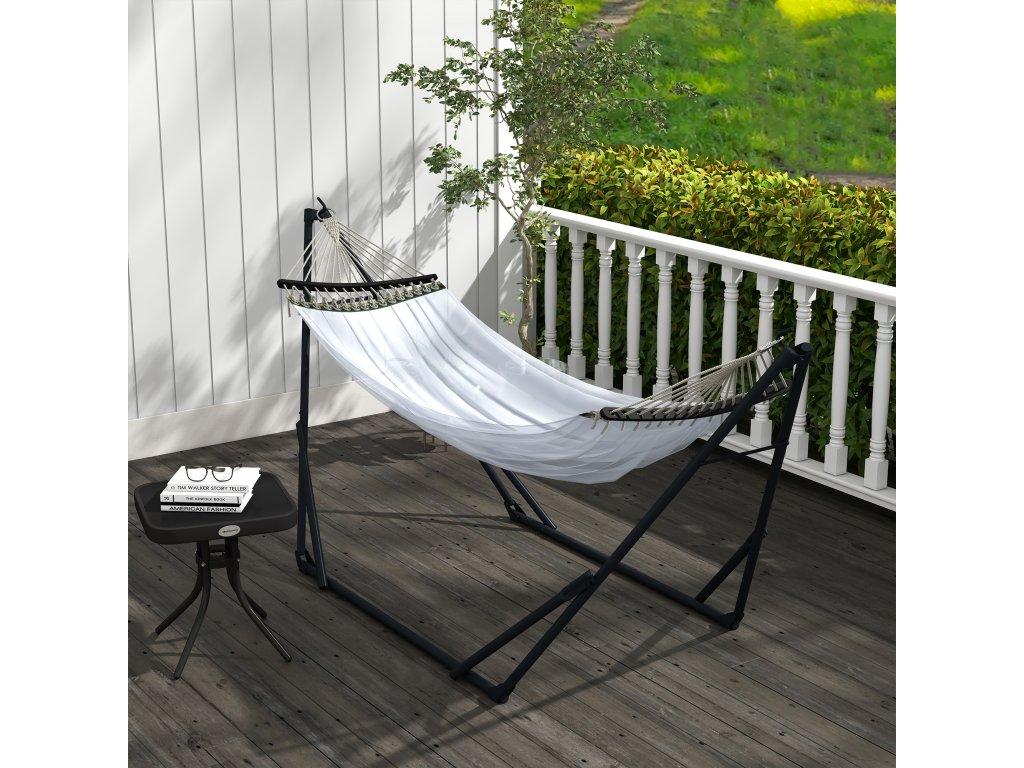S tímto stojanem na houpací síť od společnosti Outsunny můžete houpací síť zavěsit kamkoli, aniž byste potřebovali strom. Rám je vyroben z práškově lakované oceli, a proto je obzvláště stabilní a odolný. Toto provedení 2 v 1 lze snadno přeměnit na stojan na houpací síť a stojan na závěsné křeslo. Skládací konstrukce s přenosnou taškou usnadňuje skladování a přepravu. Relaxujte s nylonovou houpací sítí. Houpací síť je bezpečná, stabilní a odolná vůči povětrnostním vlivům. Lze ji používat venku po celý rok.