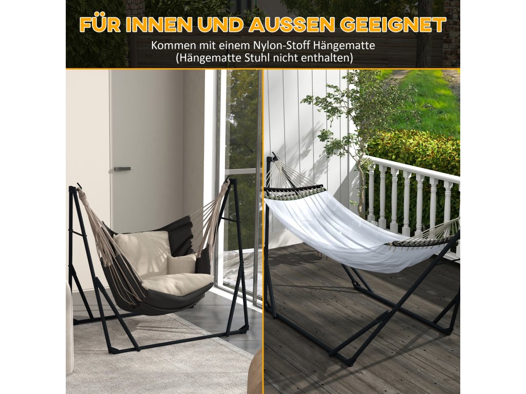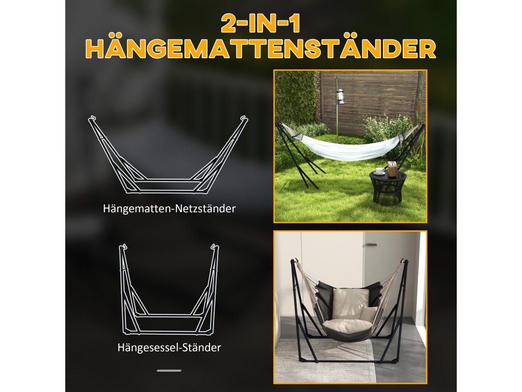 - ✔ Stojan na houpací síť 2 v 1, který se snadno přemění na stojan na houpací sítě a stojan na houpací křesla