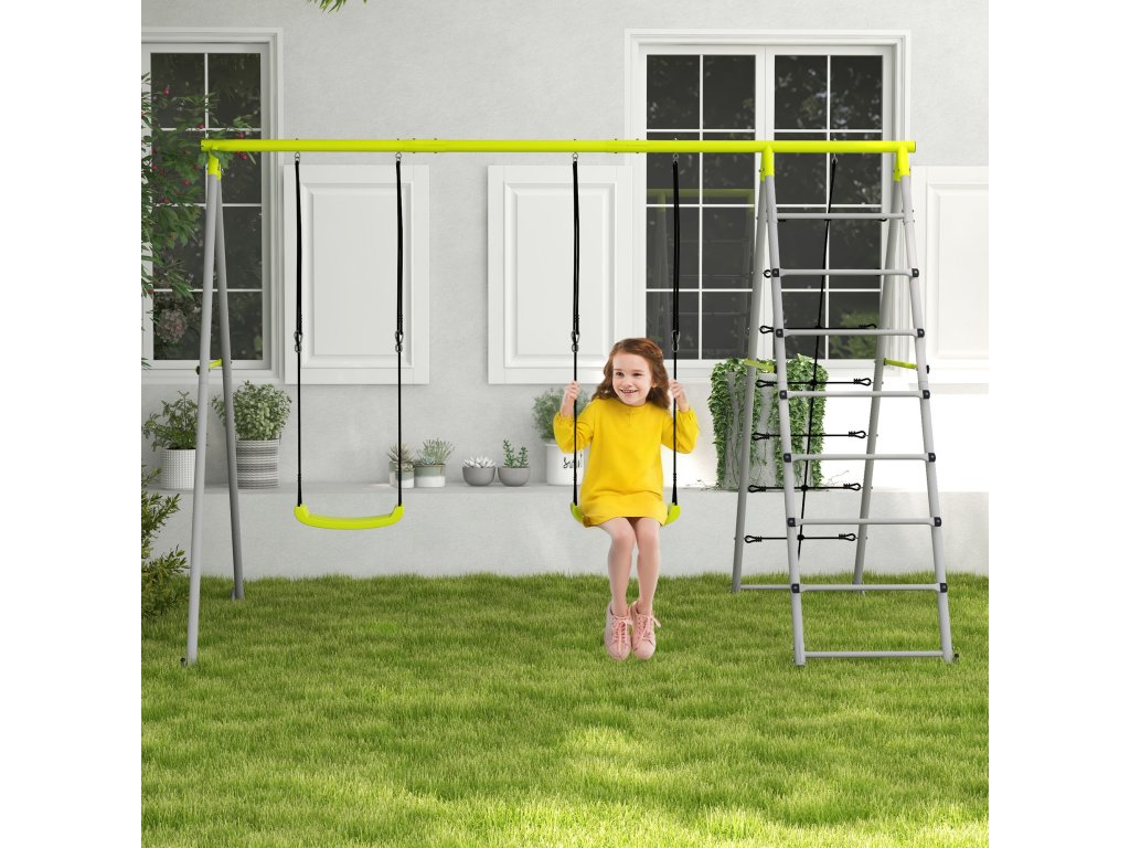 Houpačka Outsunny 2 v 1, dvoumístná houpačka, dětská houpačka, se sítí na šplhání, žebřík, ocelová, stabilní, zelená | Aosom.de