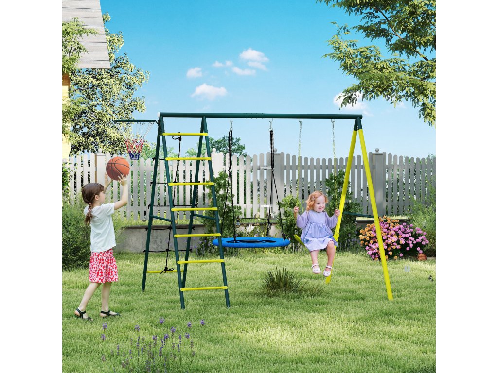 Houpačka Outsunny 4 v 1, houpací lešení, dětská houpačka, dvoumístná houpačka, basketbalový koš, žebřík na šplhání, ocel, žlutá | Aosom.de