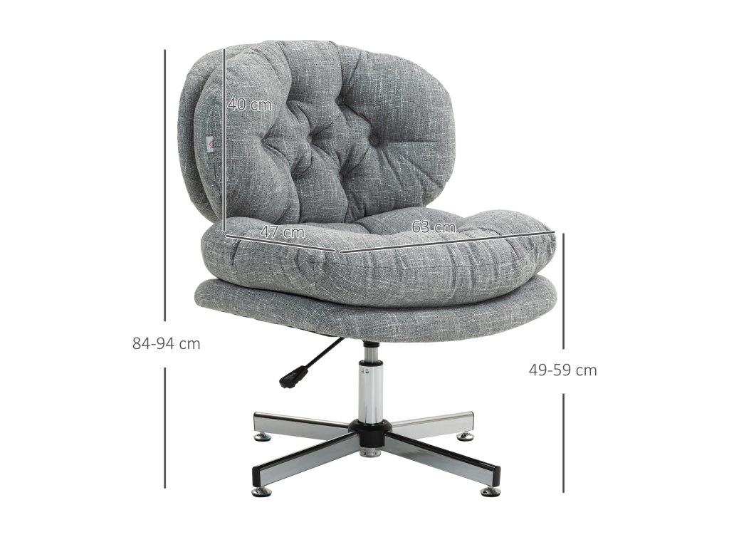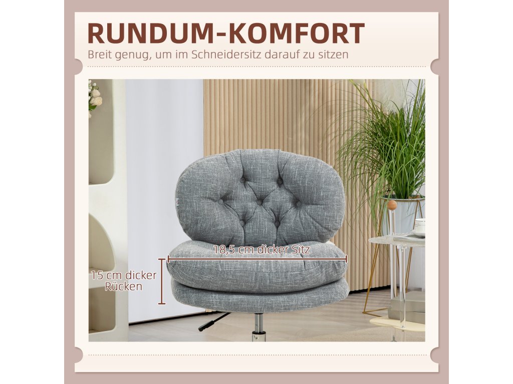 Vyzkoušejte pohodlí ergonomické kancelářské židle HOMCOM: 18,5 cm silný sedák s pěnovým polstrováním a 15 cm silný opěrák, který je zabalený do vzdušné látky lněného vzhledu. Houpejte se snadno dopředu a dozadu díky funkci houpání a snadno si nastavte výšku. Tato kancelářská židle, která se skvěle hodí ke každému pracovnímu stolu, je nezbytným prvkem vašeho pracovního prostoru.