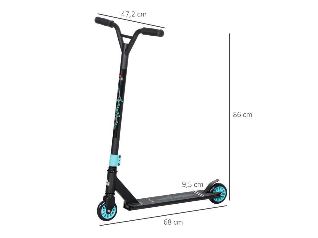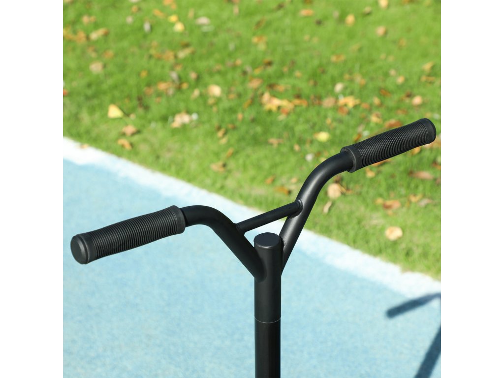 Naše koloběžka HOMCOM s černým rámem a 10 cm pneumatikami z kvalitní gumy zajišťuje díky protiskluzovému povrchu bezpečnost při provádění kaskadérských kousků. Vestavěná zadní brzda kaskadérské koloběžky poskytuje dodatečnou stabilitu a umožňuje kdykoli bezpečně zastavit. Tato kaskadérská koloběžka je ideálním dárkem pro vaše děti nebo dospělé jezdce. Ideální na společné procházky, které děti zabaví na cestách.