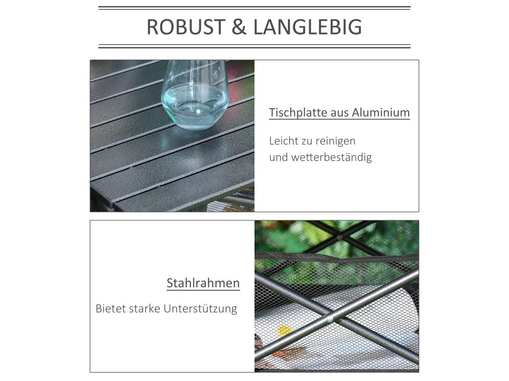 - STOLÍK Z HLINÍKU: Snadno se vyjímá a snadno se balí. Lehký pro snadnou přepravu. Odolný vůči povětrnostním vlivům a snadno se čistí.
