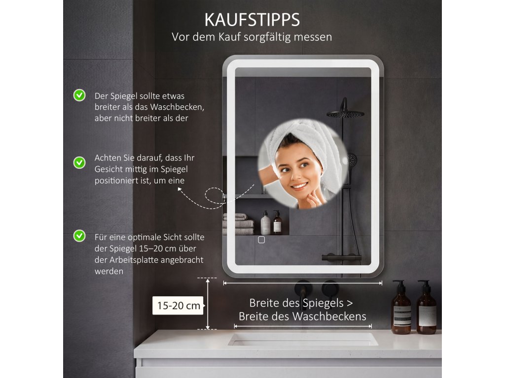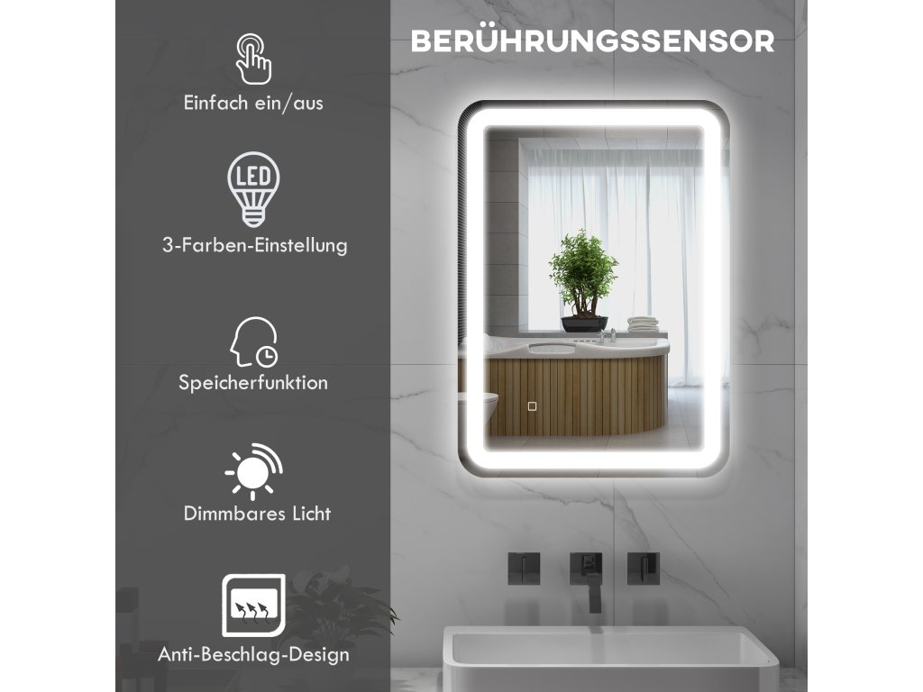 kleankin koupelnové zrcadlo LED 50 x 70 cm se 3 barvami světla a dotykovým spínačem, IP44, automatická ochrana proti zamlžení, paměťová funkce, tvrzené sklo stříbrné | Aosom.de
