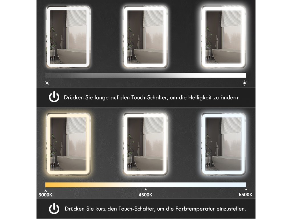- Přizpůsobitelné osvětlení LED: Vyberte si mezi třemi úrovněmi jasu podle své nálady a požadavků - teplá bílá, přirozená bílá a studená bílá. Ovládání koupelnového zrcadla je tak jednoduché, že stačí krátce nebo dlouze stisknout dotykový spínač a vytvořit si v koupelně dokonalou světelnou náladu