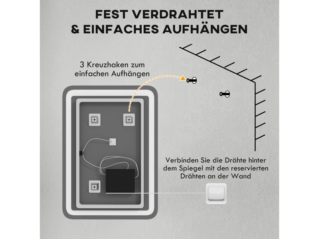 - Údaje o výrobku: Zrcadlo je vyrobeno z kvalitního a odolného materiálu: Celková velikost: 50L x 4W x 70H cm. Koupelnové zrcadlo musí být pro svou funkci připojeno k elektrické síti. Není nutná žádná montáž, můžete jej připevnit na stěnu buď vertikálně, nebo horizontálně pomocí šroubů a 3 háčků