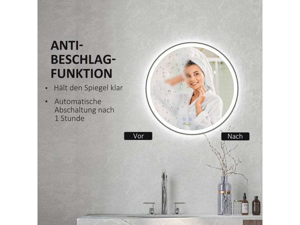 kleankin koupelnové zrcadlo s LED osvětlením, Ø 60 cm osvětlené zrcadlo s dotykovou funkcí, paměťová funkce bez mlhy s hliníkovým rámem | Aosom