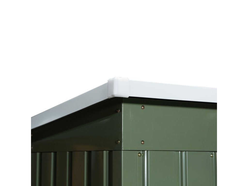 - ODOLNOST PROTI POČASÍ: Ocel je potažena plastovou fólií, díky které je kůlna na nářadí odolná proti povětrnostním vlivům a nečistotám. Šikmá střecha umožňuje hromadění dešťové vody.