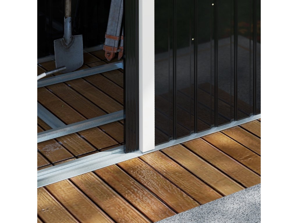 - ODOLNOST PROTI POČASÍ: Ocel je potažena plastovou fólií, díky které je kůlna na nářadí odolná proti povětrnostním vlivům a nečistotám. Šikmá střecha umožňuje hromadění dešťové vody.